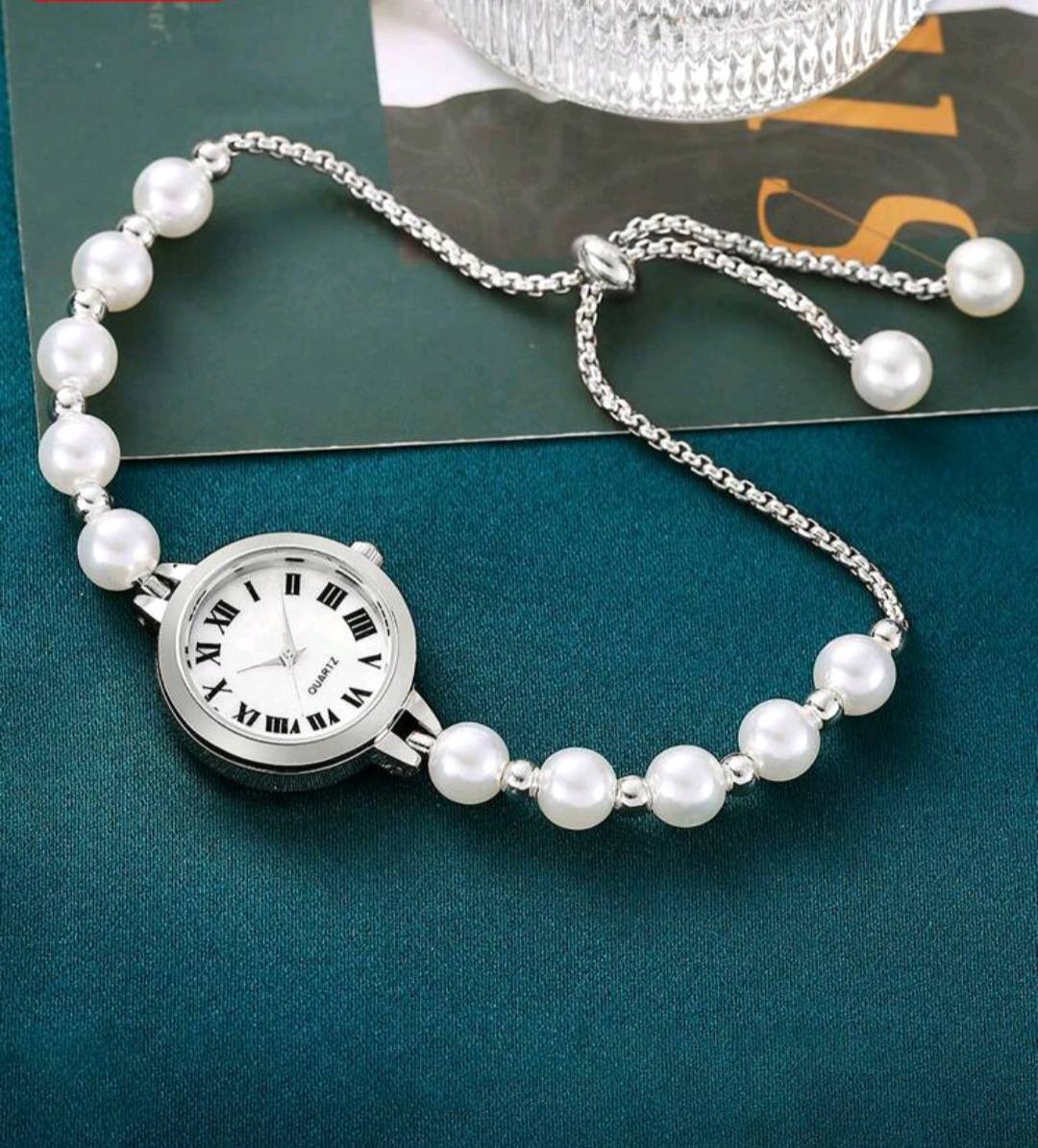 1 pc Women’s Elegant Silver-Tone Wristwatch with Synthetic Bead Strap