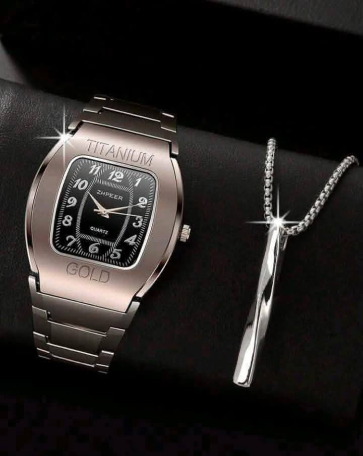 1pc Men Watch Gold Stainless Steel Strap Fashionable Letter Detail Square Dial Quartz Watch & 1pc Pendant Necklace