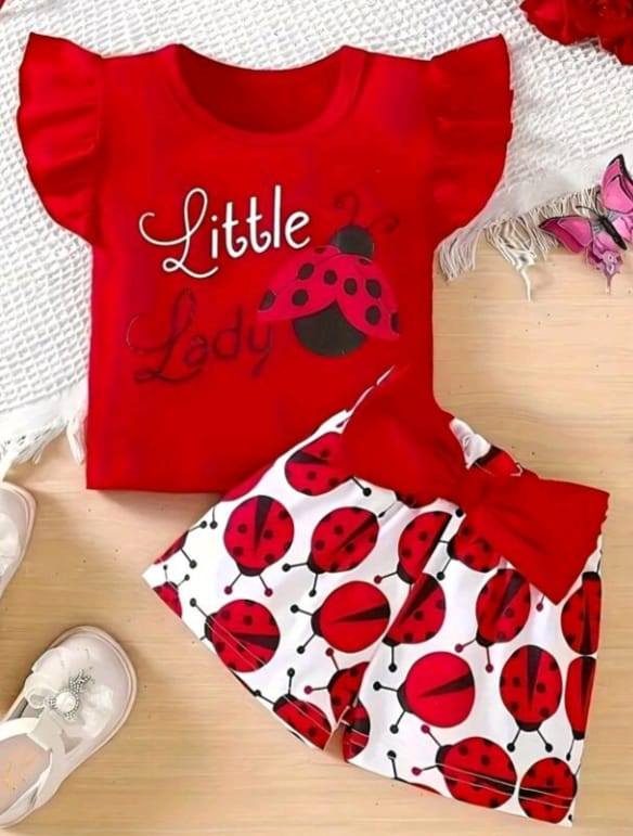 Specification: 2pcs Baby Girls’ Daily Cute Comfortable Outfit, Includes Cap Sleeve Ladybug Pattern Top And Elastic Waistband Bloomers With Bowknot