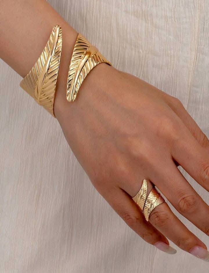 2PCS Geometric Crossing Leaves Cuff Bangles Ring for Women Holiday Fashionable Retro Metal Opening Bracelet Ring Jewelry Set