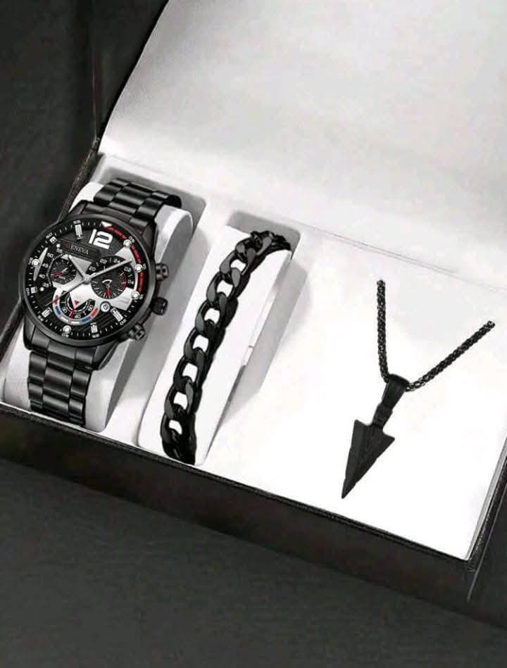 3pcs/set Fashion Men’s Watch Black Alloy Analog Male Watch Necklace Bracelet Men’s Jewelry Set