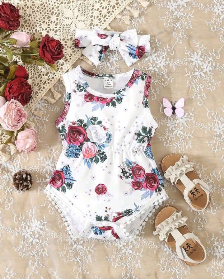 Specification: Baby Girl Elegant Floral Printed Bodysuit With Hairband