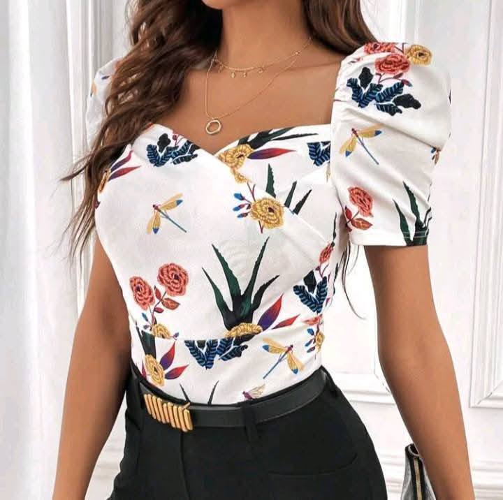 Specification: Floral Print Sweetheart Neck Puff Sleeve Tee