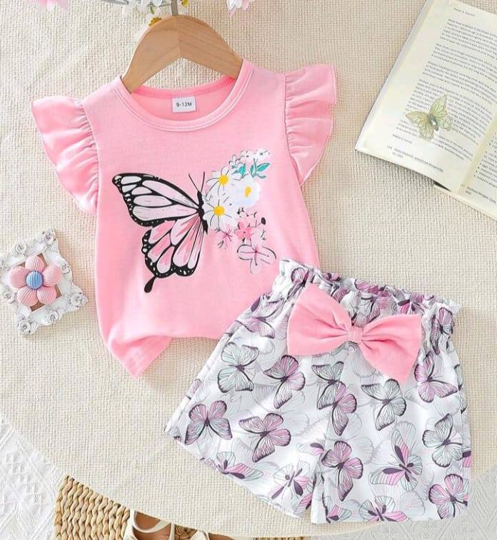 Specification: Kids’ Outfit – Sleeveless Top with Butterfly and Flower Print, Matching Shorts with Butterfly Pattern