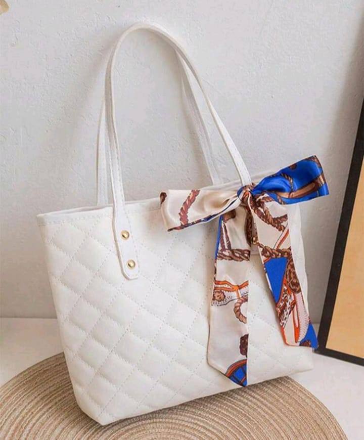 New Large Capacity Argyle Pattern Handbag With Silk-Like Scarf Decor, Lightweight Tote Bag Shoulder Bag For Women