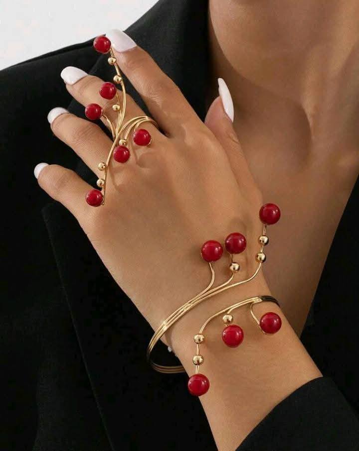Red Pearls Bracelet and Ring Set Simple Fashion Jewelry