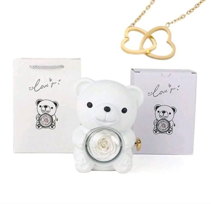 Rotating bear jewelry box set featuring a preserved rose and a heart-shaped necklace.