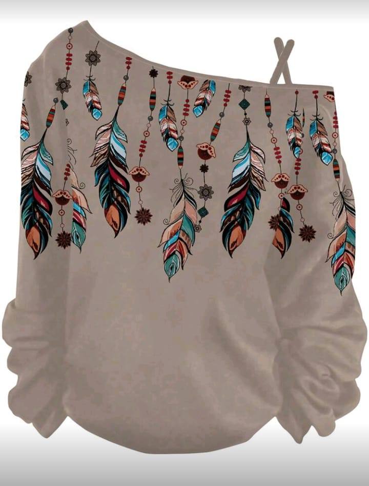 Women Casual Feather Western Print Single Long Sleeve T-Shirt