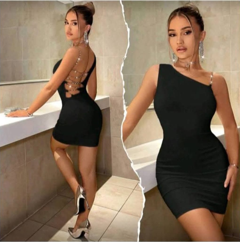 Specification: Women’s Asymmetrical Neck Asymmetrical Diamond Chain Strap Tight Dress With Open Back