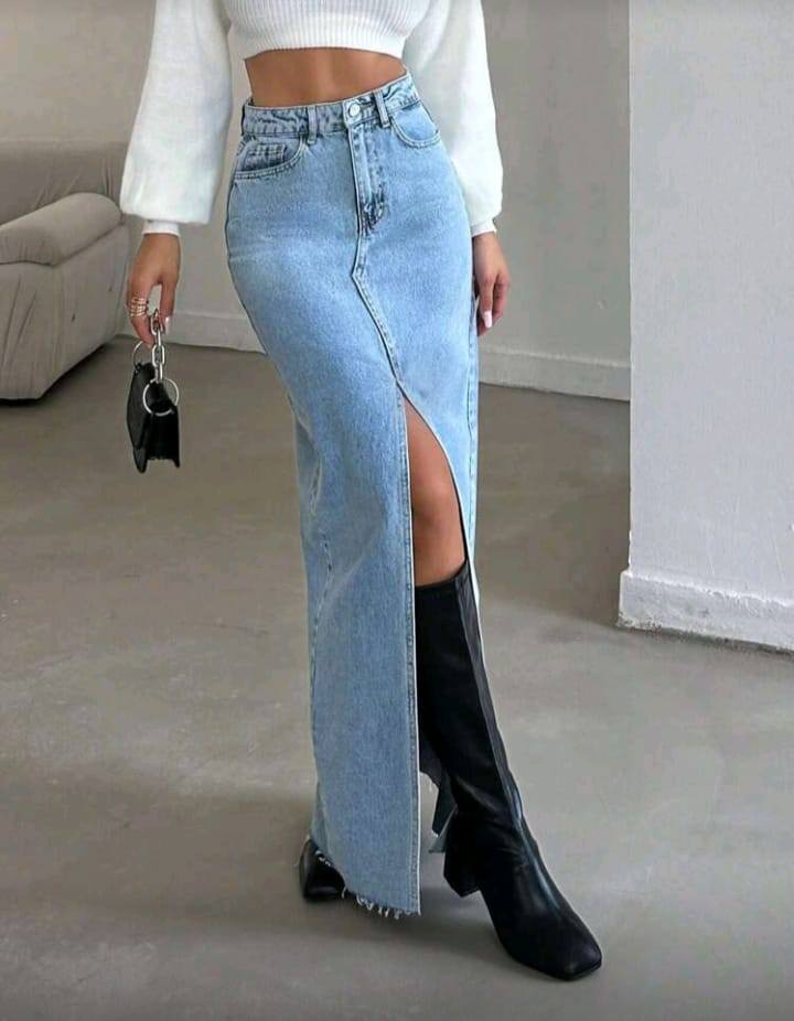 Specification: Women’s Solid Color Pocket Slit Maxi Denim Skirt