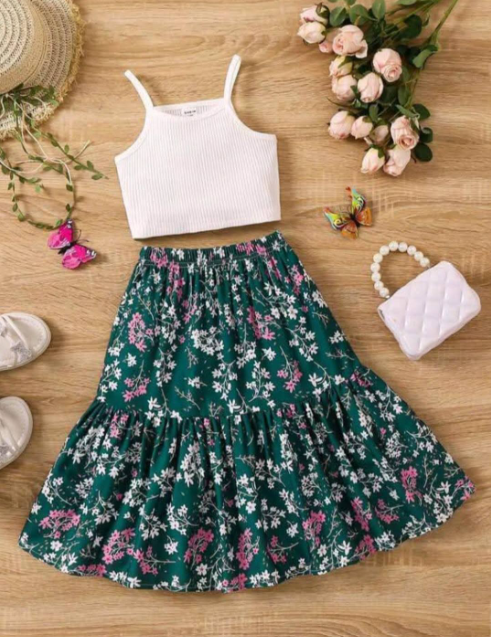Specification: Young Girl 2pcs Ditsy Floral Vacation Style Skirt And Cami Top Set
